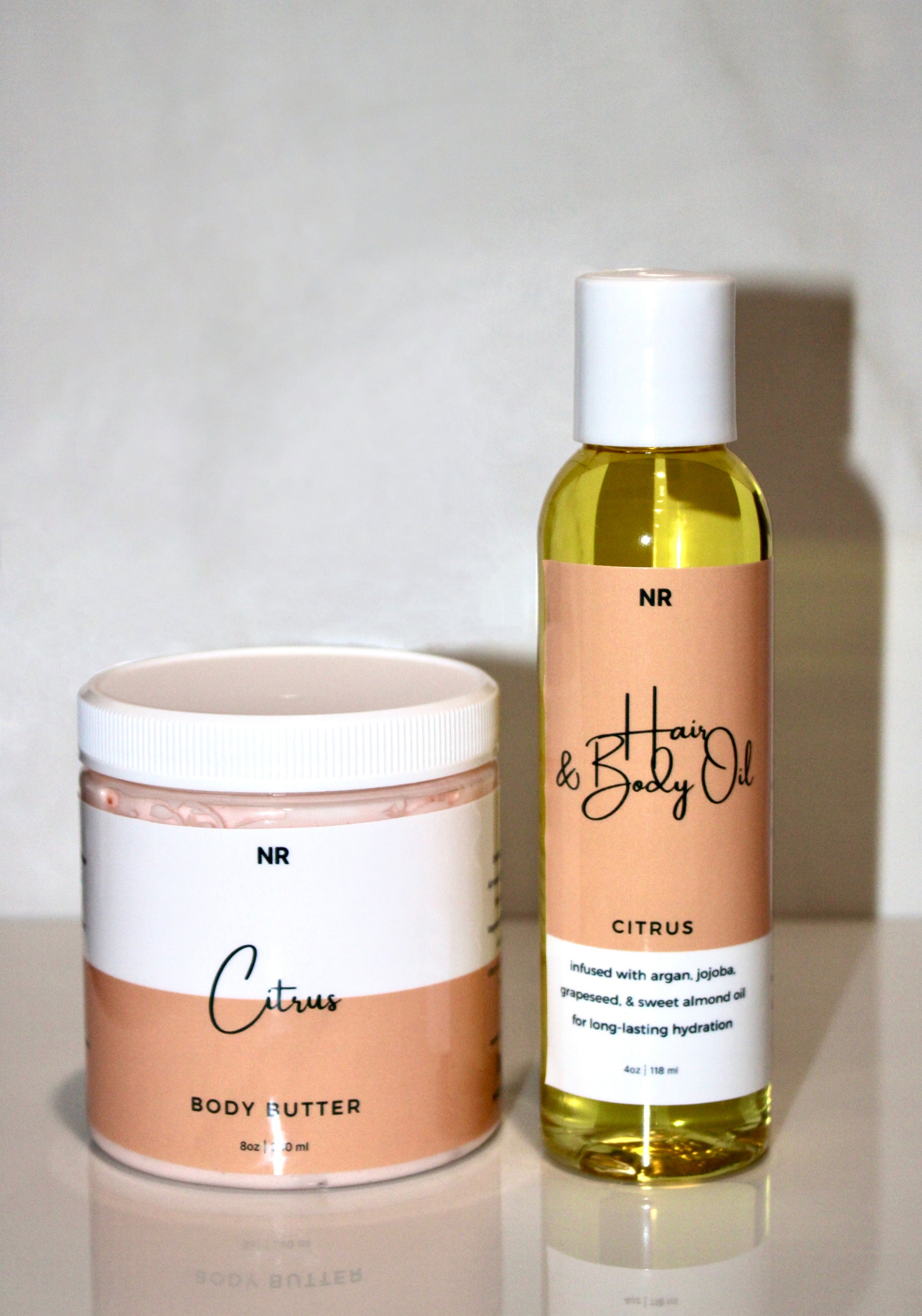 Infuse your skin and hair with the vibrant freshness of citrus with our Citrus Hydration Body Set. This revitalizing set includes a Body Butter and Hair & Body Oil, both designed to deeply hydrate, nourish, and refresh - leaving you feeling invigorated and your skin and hair soft, smooth, and beautifully scented.